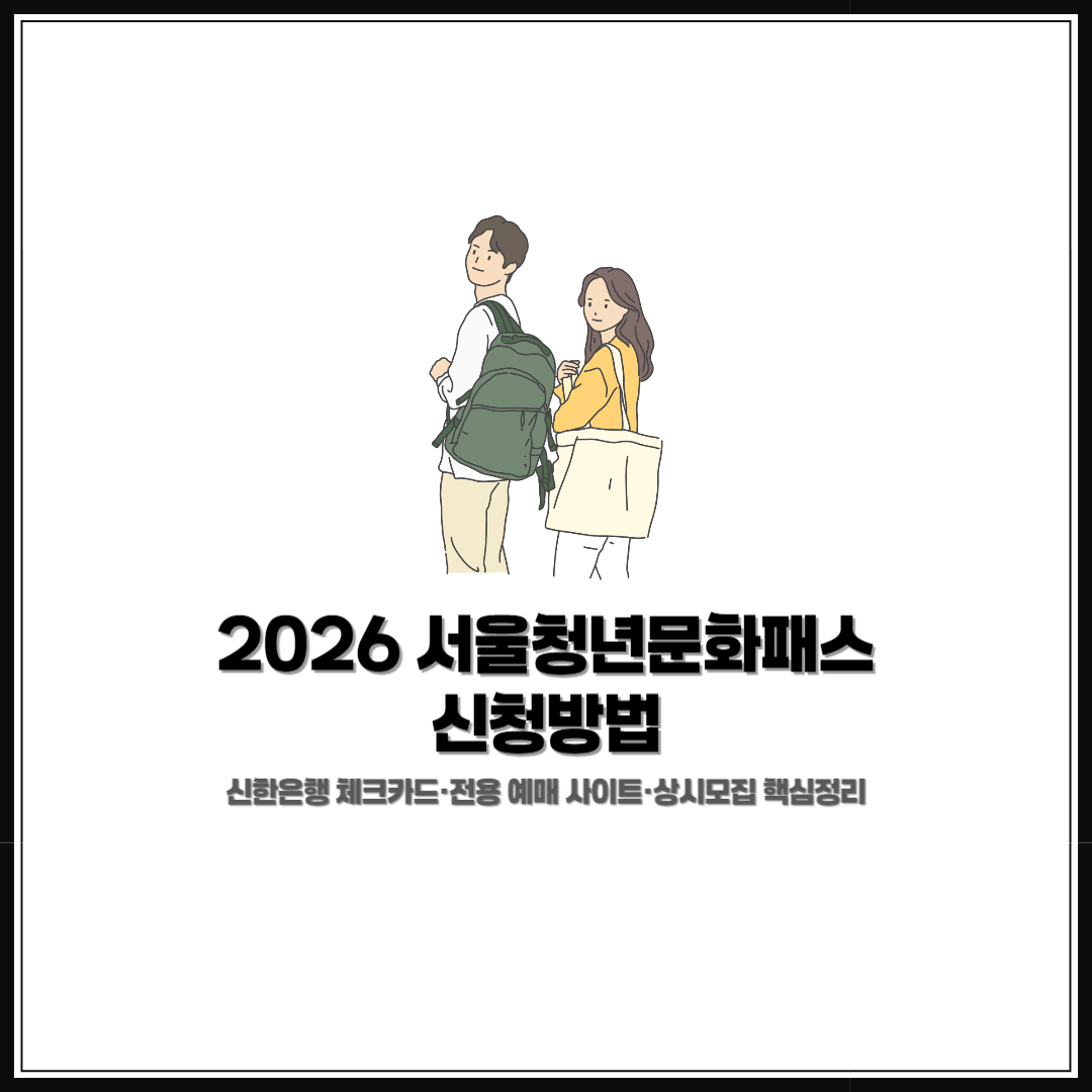 서울에 거주하는 청년이라면 문화생활 비용을 줄일 수 있는 제도가 있습니다. 바로 서울청년문화패스입니다. 2026년부터는 지원 연령과 신청 방식이 바뀌어 제도를 정확히 이해하는 것이 중요해졌습니다. 이 글에서는 2026년 1월 기준 서울청년문화패스 신청 자격·방법, 신한은행 체크카드 발급, 전용 예매 사이트 이용 시 주의사항을 정리합니다.